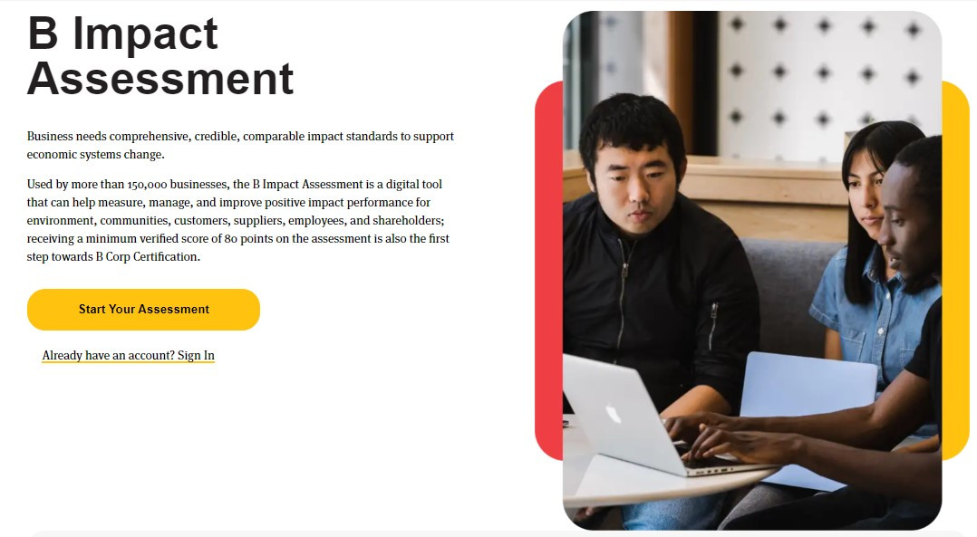 Source https://www.bcorporation.net/en-us/programs-and-tools/b-impact-assessment/ Organisation B corporation Description Tool to asset, compare and improve your impact. Tool language English End user Company Age 18+ Objectif Deploy Evaluate yourself Ease of use Advanced Cost Chargeable Mentioned SDG's No