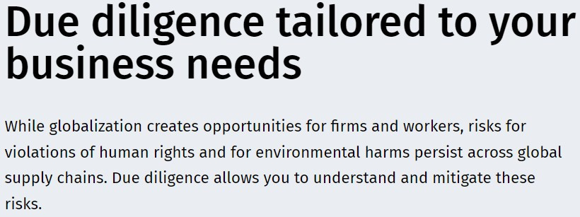 Source https://www.duediligencetoolbox.be/en Organisation Federal Institute for Sustainable Development, KU Leuven - HIVA, Statik, Adelphi, The Shift Description While globalization creates opportunities for firms and workers, risks for violations of human rights and for environmental harms persist across global supply chains. Due diligence allows you to understand and mitigate these risks. Tool language Dutch French English End user Company Age 18+ Objectif Deploy Ease of use Advanced Cost Free Mentioned SDG's No Principles: People Yes Principles: Planet Yes Principles: Peace Yes Principles: Prosperity Yes Principles: Partnership Yes Leave no one behind Yes Differentiated focus on more vulnerable groups? Explicit Intergenerational solidarity? Explicit International solidarity? Explicit