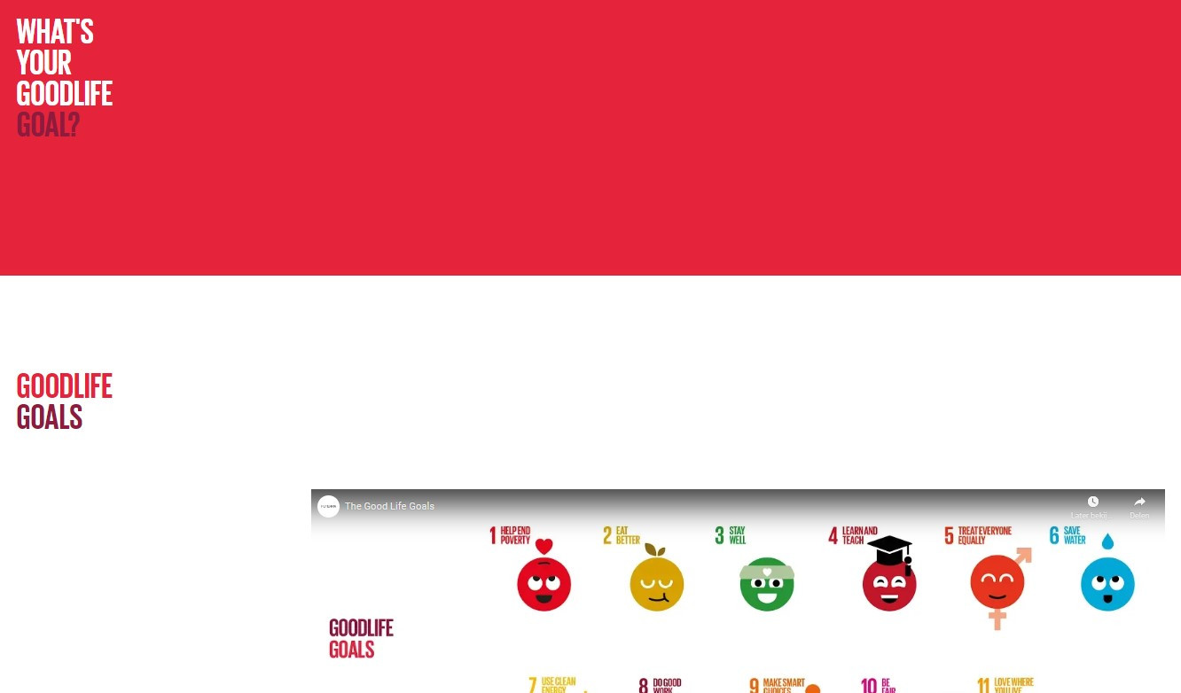 Source https://www.goodlifegoals.org/ Organisation United Nations Description Stelt de SDG’s op een heel laagdrempelige manier voor met leuke filmpjes en toffe icoontjes. Tool language English End user Individual citizen Age 18+ Objectif Discover Ease of use Beginner Cost Free Mentioned SDG's Explicit Concerned SDG's