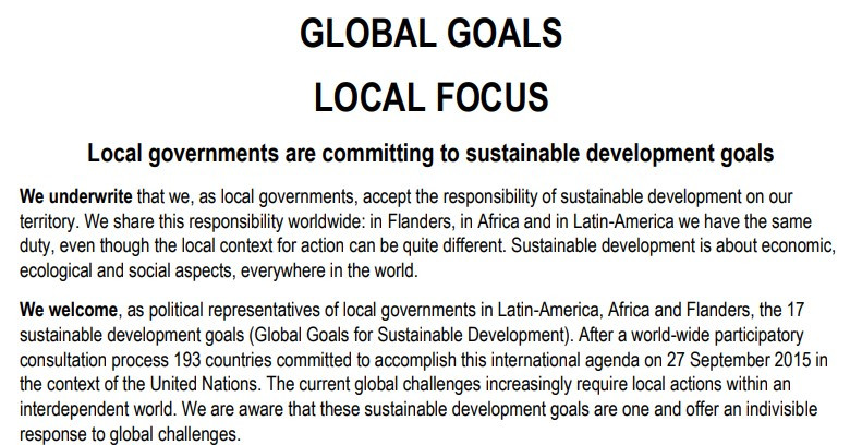 Source https://www.vvsg.be/Leden/Internationaal/SDG-pagina/SDG%20en%20beleid/engagementsverklaring/2016030… Organisation VVSG Description Local authorities who sign the SDG declaration of commitment undertake to bring their territory on the path to sustainable development in their territory, on a social, economic and environmental level. The United Nations 2030 Agenda, with its 17 sustainable development goals, is taken as a guideline. Tool language Dutch French German English End user Public administration Age 18+ Objectif Deploy Ease of use Beginner Cost Free Mentioned SDG's Explicit Concerned SDG's Principles: People Yes Principles: Planet Yes Principles: Peace Yes Principles: Prosperity Yes Principles: Partnership Yes Leave no one behind No