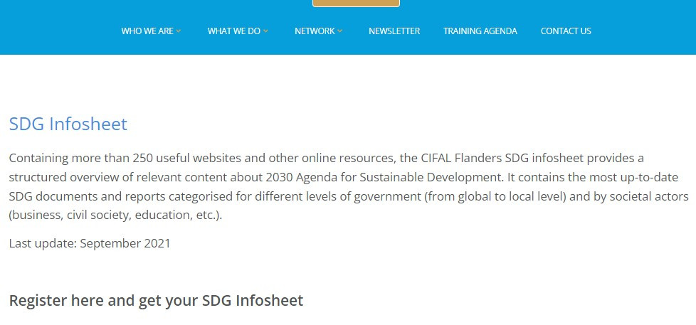 Source https://cifal-flanders.org/what-we-do/sdg-materials/sdg-publications/sdg-infosheet/ Organisation CIFAL Flanders Description Containing more than 250 useful websites and other online resources, the CIFAL Flanders SDG infosheet provides a structured overview of relevant content about 2030 Agenda for Sustainable Development. It contains the most up-to-date SDG documents and reports categorised for different levels of government (from global to local level) and by societal actors (business, civil society, education, etc.). Tool language English End user Individual citizen Age 18+ Objectif Discover Deploy Ease of use Beginner Cost Free Mentioned SDG's Explicit Concerned SDG's